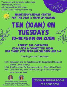 Join MECDHH/GBSD’s Shana Kelley-Cohen, LCSW, and Early Intervention providers in this Zoom connection group for caregivers of children who are Deaf or Hard of Hearing, ages 0-8. Every Tuesday at 10:00AM.