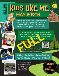 Join us on this overnight event in the Carrabassett Valley, May 9 – 10! KLM is an outdoor experiential learning program for Maine Deaf and Hard of Hearing students in grades 6-12. Come build connections with DHH peers, develop independent skills, and learn in the great outdoors!
