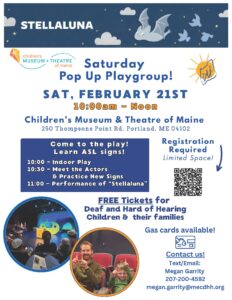 Join us at the Children’s Museum and Theatre of Maine in Portland from 10:00am – 12:00pm for a performance of Stellaluna with ASL interpretation! For more information, contact Megan Garrity at 207-200-4592 or email her at megan.garrity@mecdhh.org.